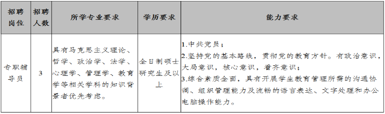 為適應(yīng)學(xué)校發(fā)展的需要,需面向社會(huì)誠(chéng)聘3名專(zhuān)職輔導(dǎo)員,現(xiàn)將有關(guān)事項(xiàng)公告如下: